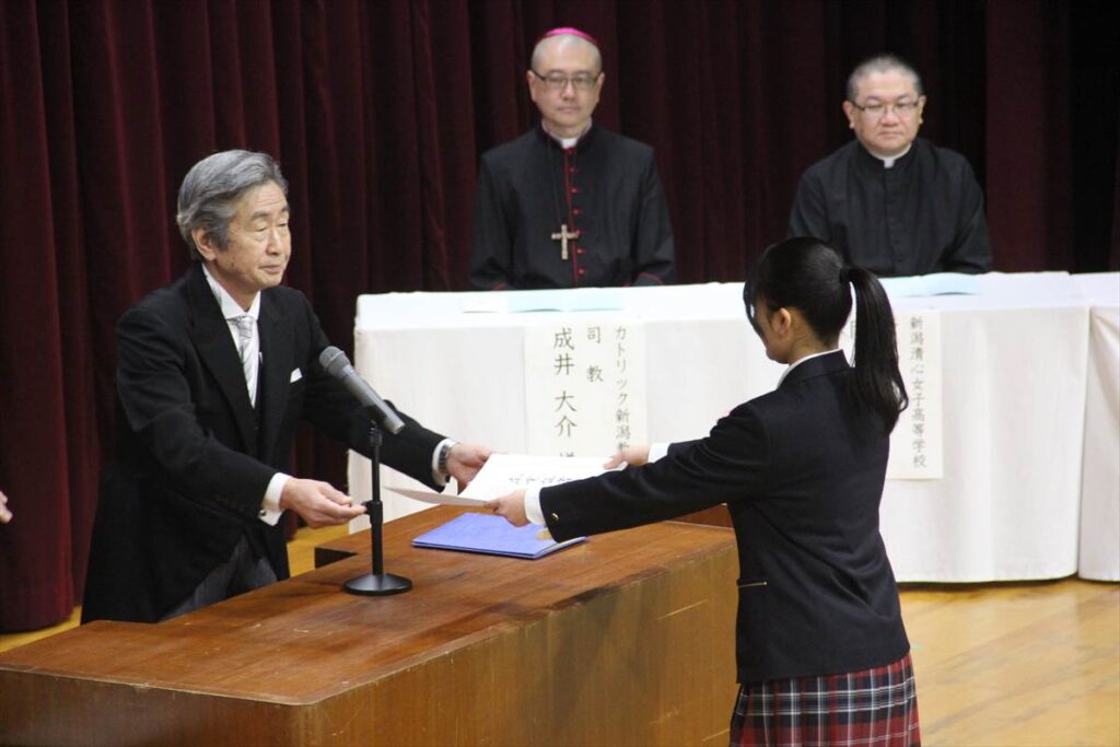 校長先生の式辞、在校生の送辞、そして卒業生の答辞は、卒業式のハイライトですね。高校3年間の様々な思いや、新潟清心を本当に大切にしている思いが言葉の端々から伝わってきます。私も来賓として祝辞を述べさせていただきました。新潟清心の校訓である「心を清くし、愛の人であれ」を日々の活動を通して身につけてきた卒業生の皆様が、これからもこの教えを大切に、幸せな人生を生きることができるよう、お祈り申し上げます。ご卒業、誠におめでとうございました。
