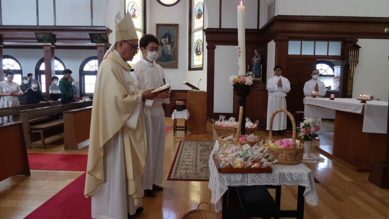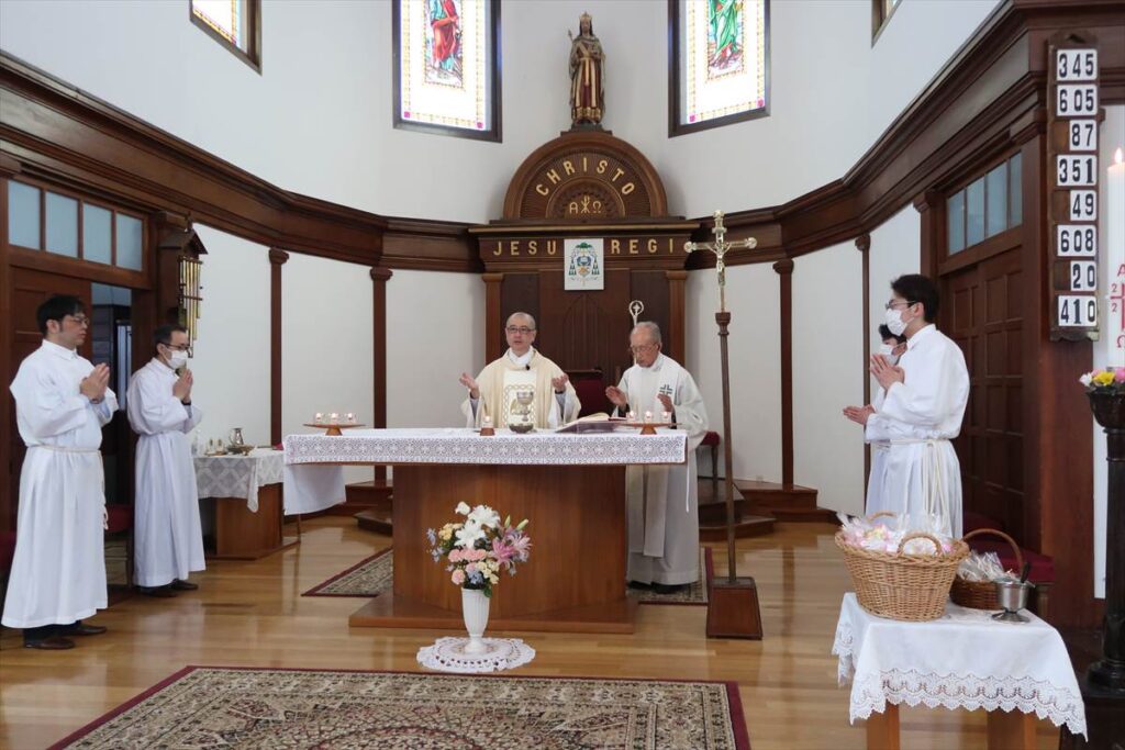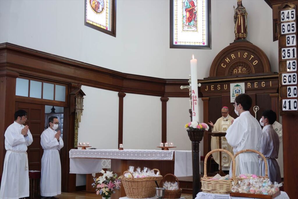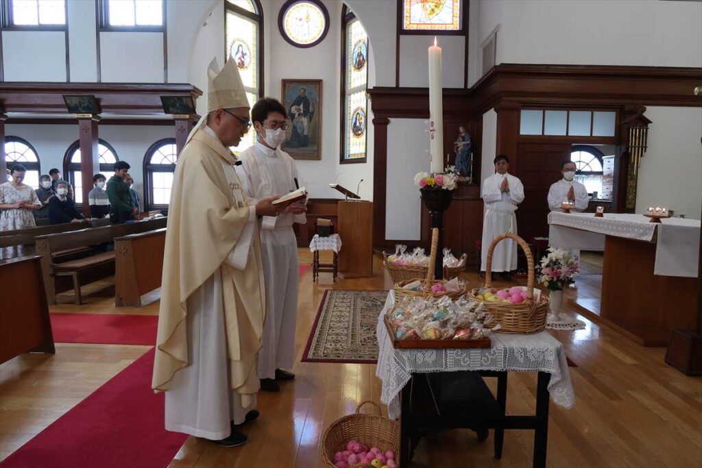 改めまして、主のご復活おめでとうございます。新潟教会では、心配された雨も上がり、ルルド前の桜も咲き始める中の復活の主日となりました。日中のミサということで、夜の運転が心配な方も大勢参加され、聖堂はいっぱい。ミサの後はカトリックセンターの2回と1回を使って祝賀会が行われ、おいしいカレーをいただきながら、歌を歌ったり楽しい時を過ごしました。準備してくださった皆様、ありがとうございました。以下、説教です。